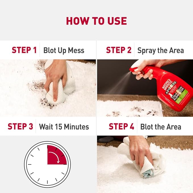 Nature’s Miracle® pet stain and odor removers have been trusted for pet mess cleanup for more than 35 years. Whatever pets do, you can trust Nature’s Miracle® stain and odor removers, training aids, disinfectants and litter products to undo. Nature’s Miracle® Advanced Stain & Odor Eliminator has a severe mess enzymatic formula that produces enzymes when it comes in contact with a food source, such as pet urine, feces, vomit and other bio-based messes. The enzymatic cleaner will continue working as long as the food source is present. This formula also includes patented microbes that target your toughest pet odors. When used and stored as directed, this product is safe for use on carpets, hard floors, furniture, fabrics and more. Nature’s Miracle® Advanced Stain & Odor Eliminator also freshens with a light fresh scent. This product is safe for your pets and home, when used and stored as directed. Trust Nature’s Miracle® products when finding solutions for a clean home and a happy, healthy pet.